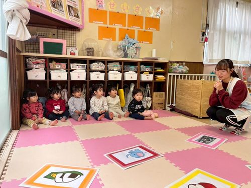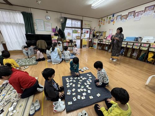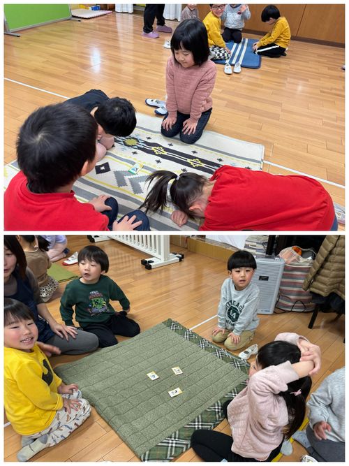 お正月遊びという事で全クラスで「かるた会」をしました。それぞれの年齢に合わせたかるたで遊びました。